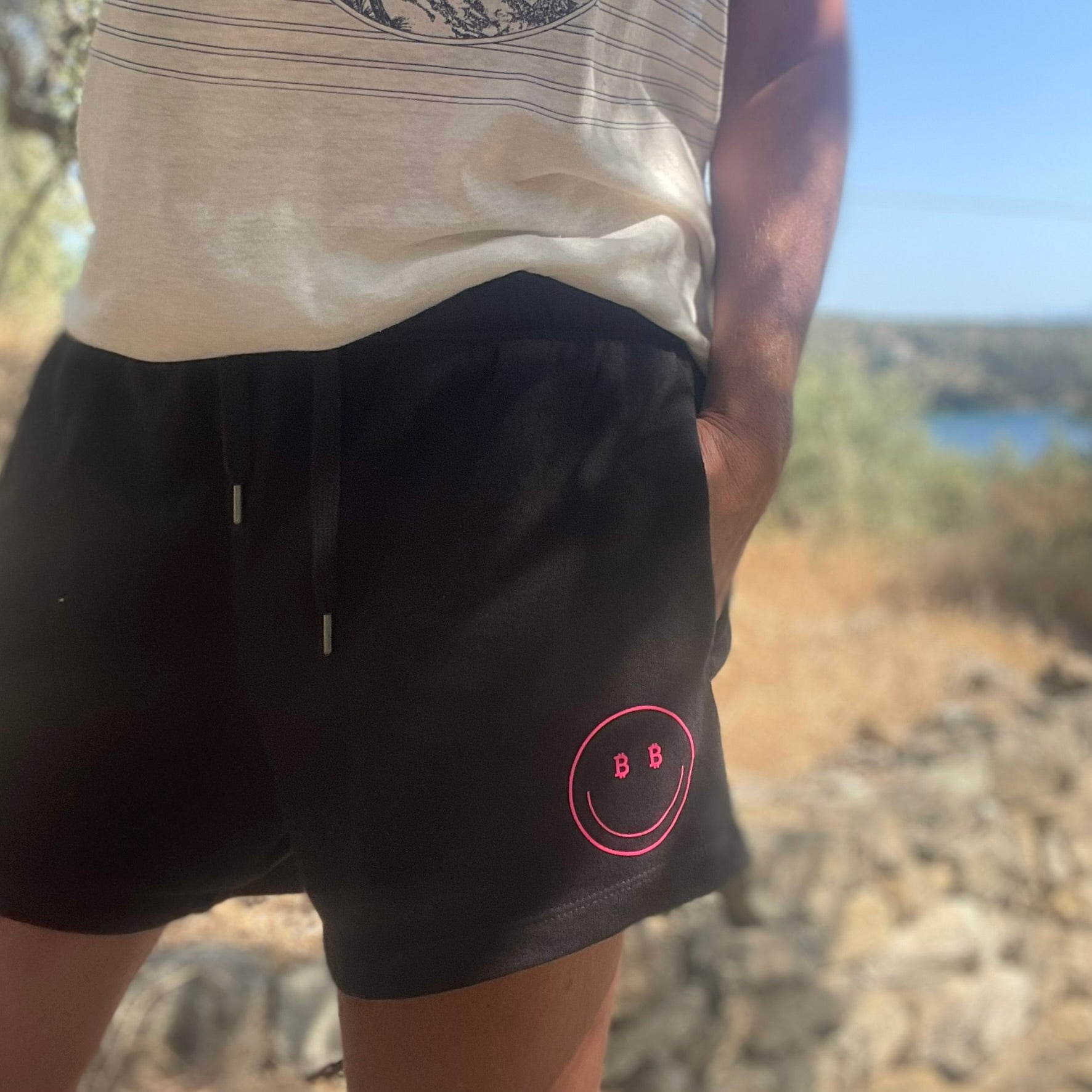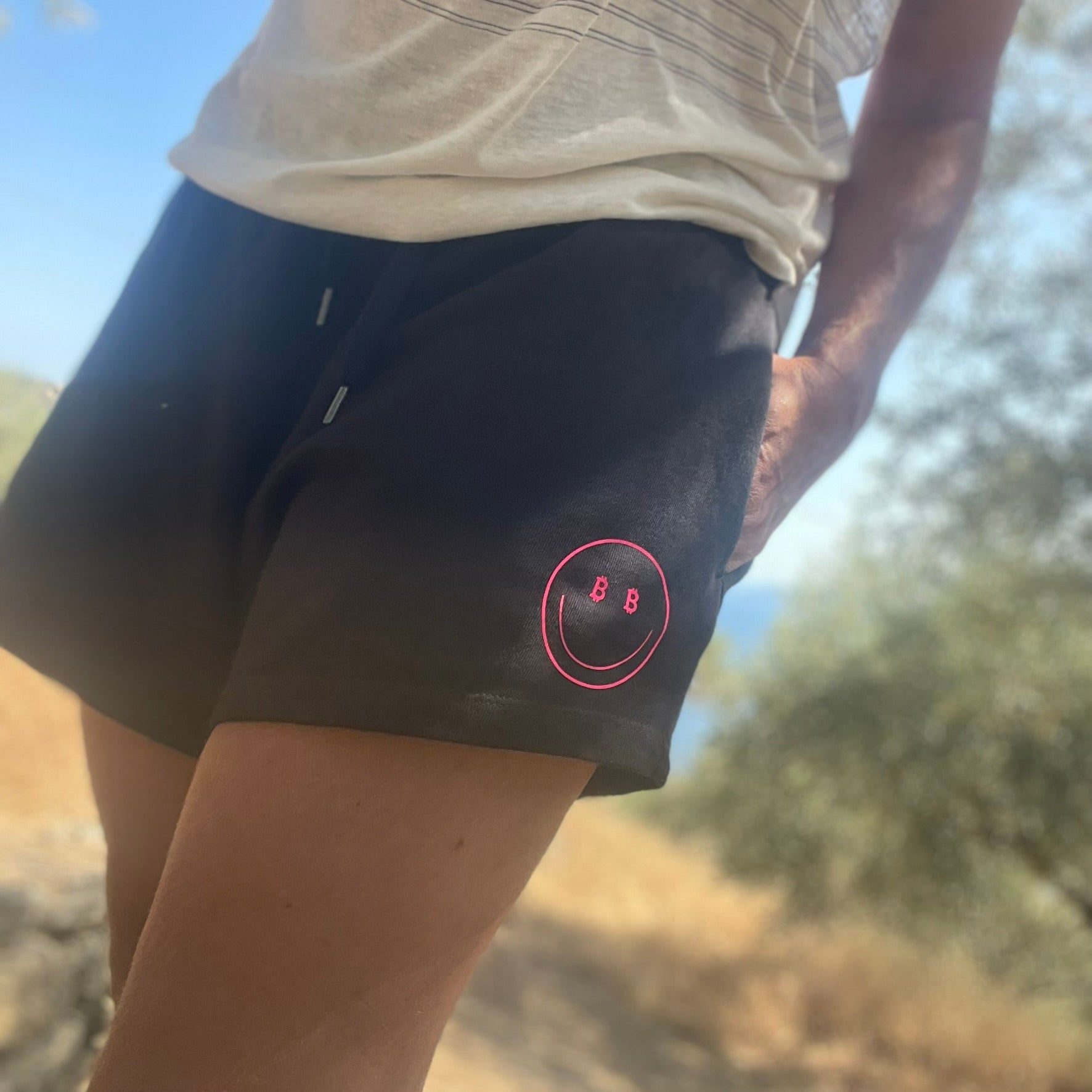 Not just lounge shorts - these are freedom shorts. Cut from heavyweight French Terry, made in Portugal, and finished with a bright pink Bitcoin-smiley that says you’re comfy but still crypto-pilled. Elastic waistband, recycled metal details, and a fit that works from beach walk to bear market. Proof that chill and conviction can coexist.